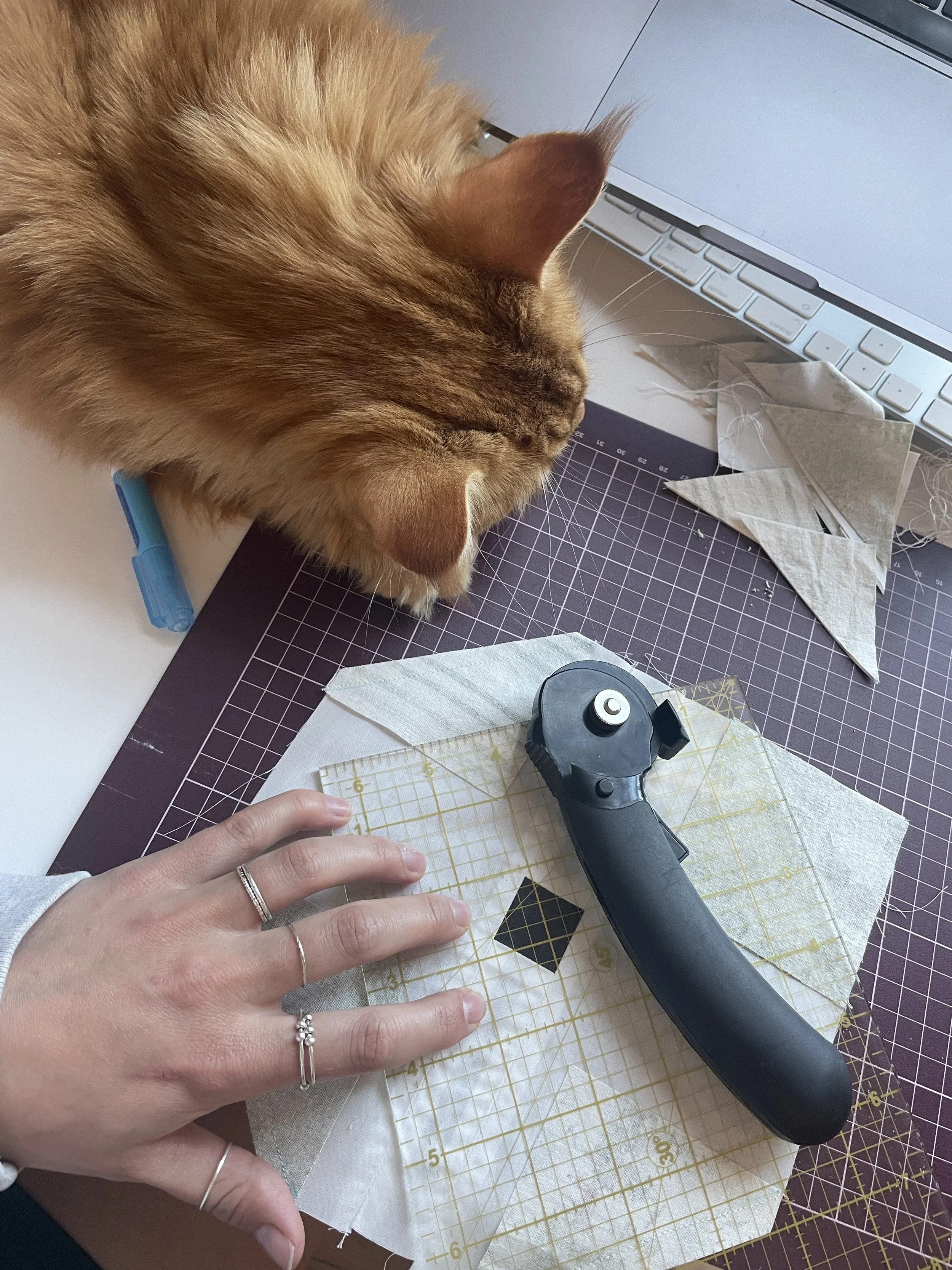 I started this quilt in our old apartment — sewing at my tiny home-office desk while Leo, our Maine Coon, tried to wedge his seven-kilo self between the fabric stacks. Space was tight, but it worked.